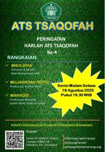 Pondok Pesantren Ats Tsaqofah pada tahun ini memasuki usia yang ke – 4 dalam hitungan masehi. Pondok Pesantren Ats Tsaqofah yang berdiri dibawah naungan Yayasan Ats Tsaqofah Semarang merupakan pengembangan dari pengelolaan yayasan yang semula berupa Majelis Ta’lim dan Dzikir Ats Tsaqofah Semarang. Yayasan Ats Tsaqofah Semarang berdiri pada tanggal 16 Agustus 2021 yang bertepatan dengan tanggal 10 Muharram 1443 H. Peringatan Harlah yang ke – 4 ini dilaksanakan secara sederhana dengan rangkaian Maulid Nabi Muhammad SAW, Rathibul Athas , dan Manaqib Syaikh Abdul Qodir Jailani.